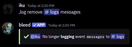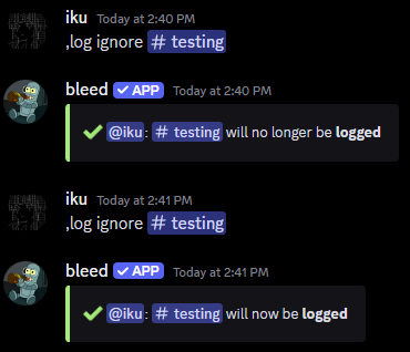 You can ignore and unignore a member or channel from being logged using thelog ignore