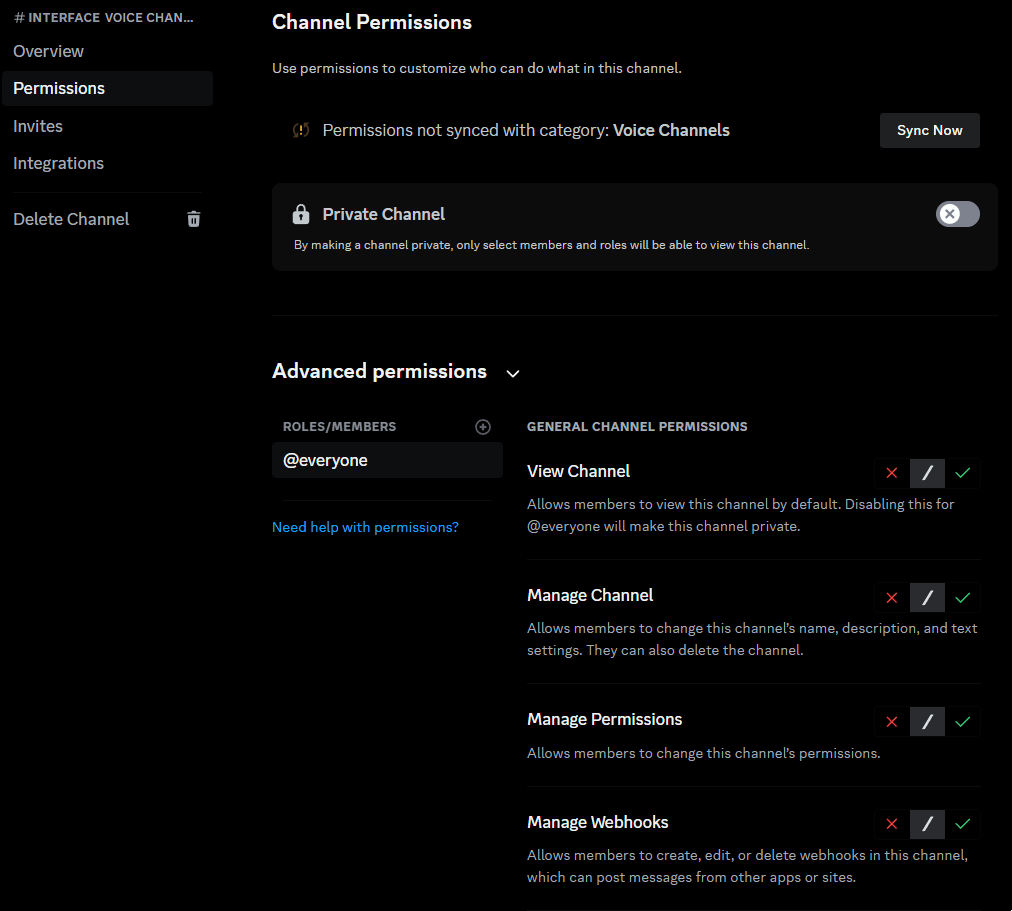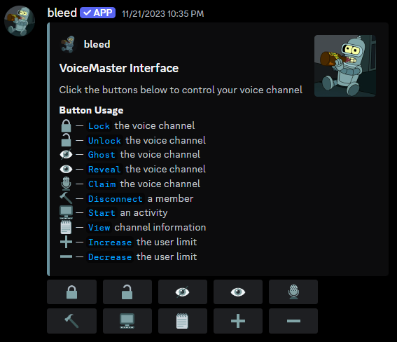 channel will contain an embed with buttons that allow members to customize their temporary voice channel. This channel should be locked to keep the embed message at the top of the channel.