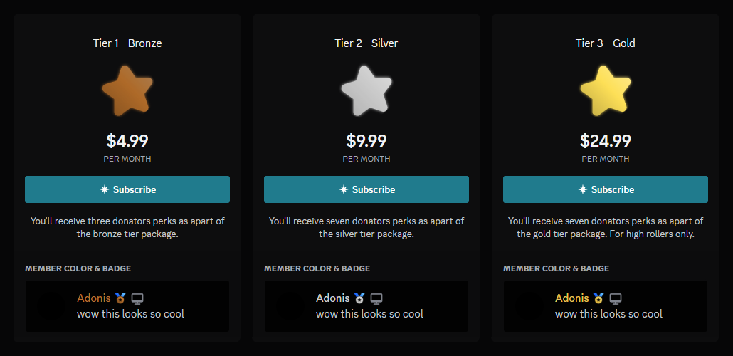 Donator perks can be purchased via server subscriptions in our Support Server which can be found at the top of the channel list labeled as Server Shop.
