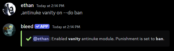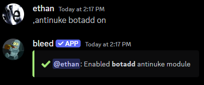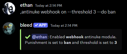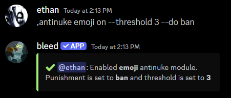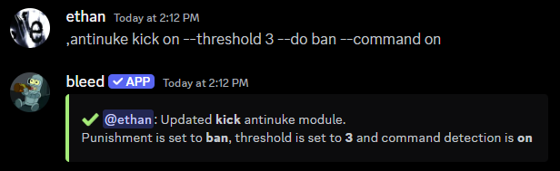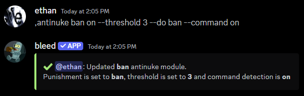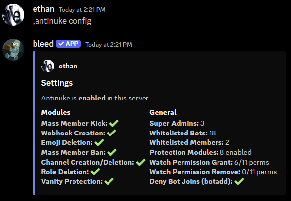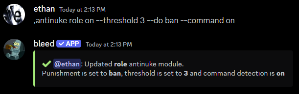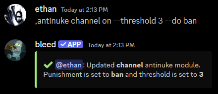 The antinuke will set a limit on the number of actions a moderator can perform in a certain time frame. If the limit is exceeded, the moderator will be punished and a message will be sent to the owner.Configuring the antinuke